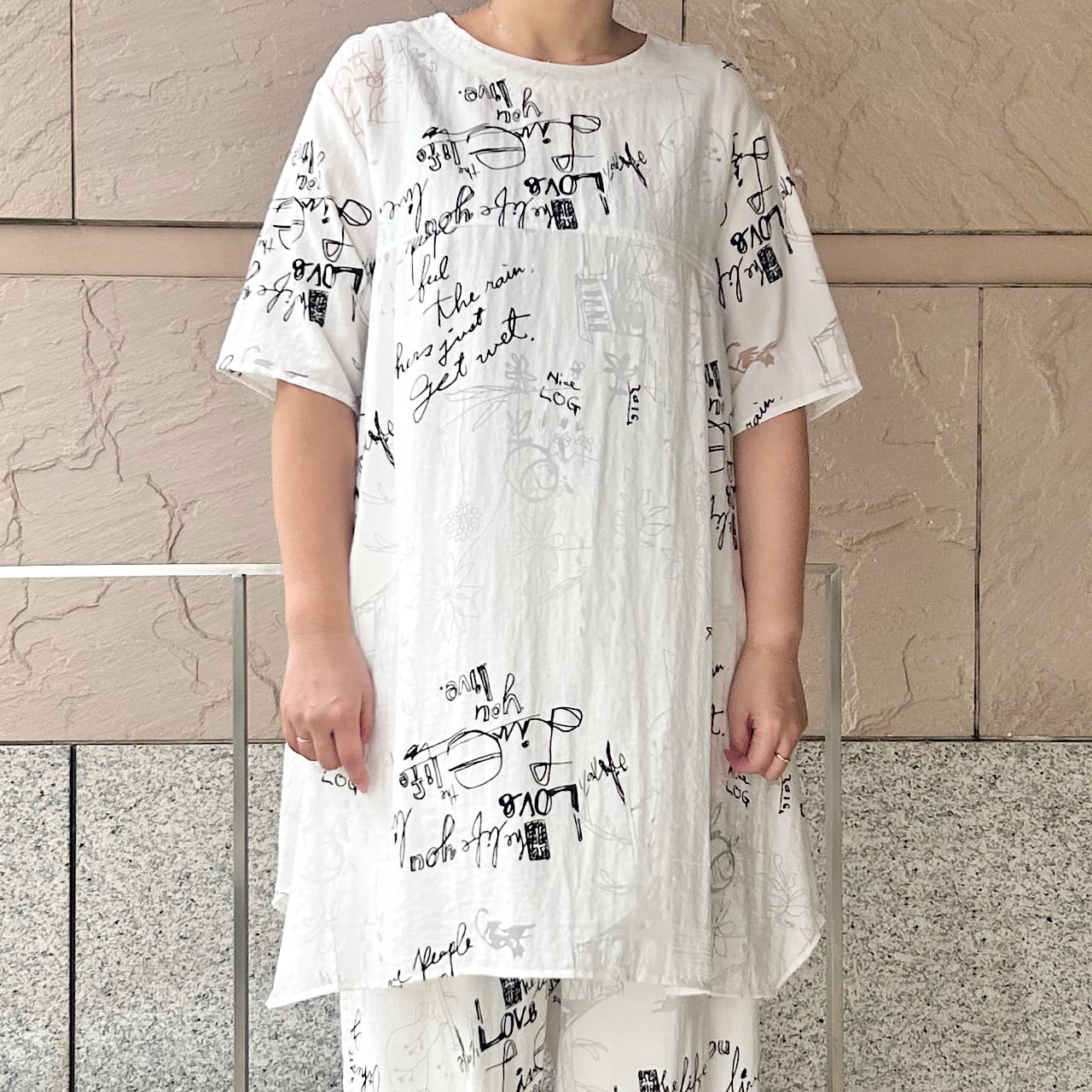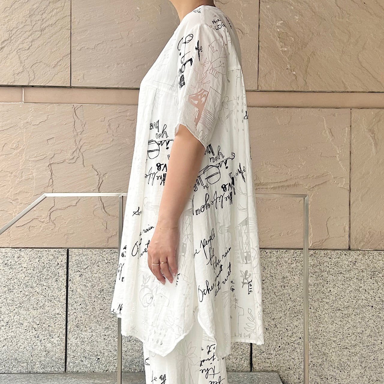 オパールの透け感からくる清涼感と英文字プリントのポップさが相まって軽さの感じられる表情です。