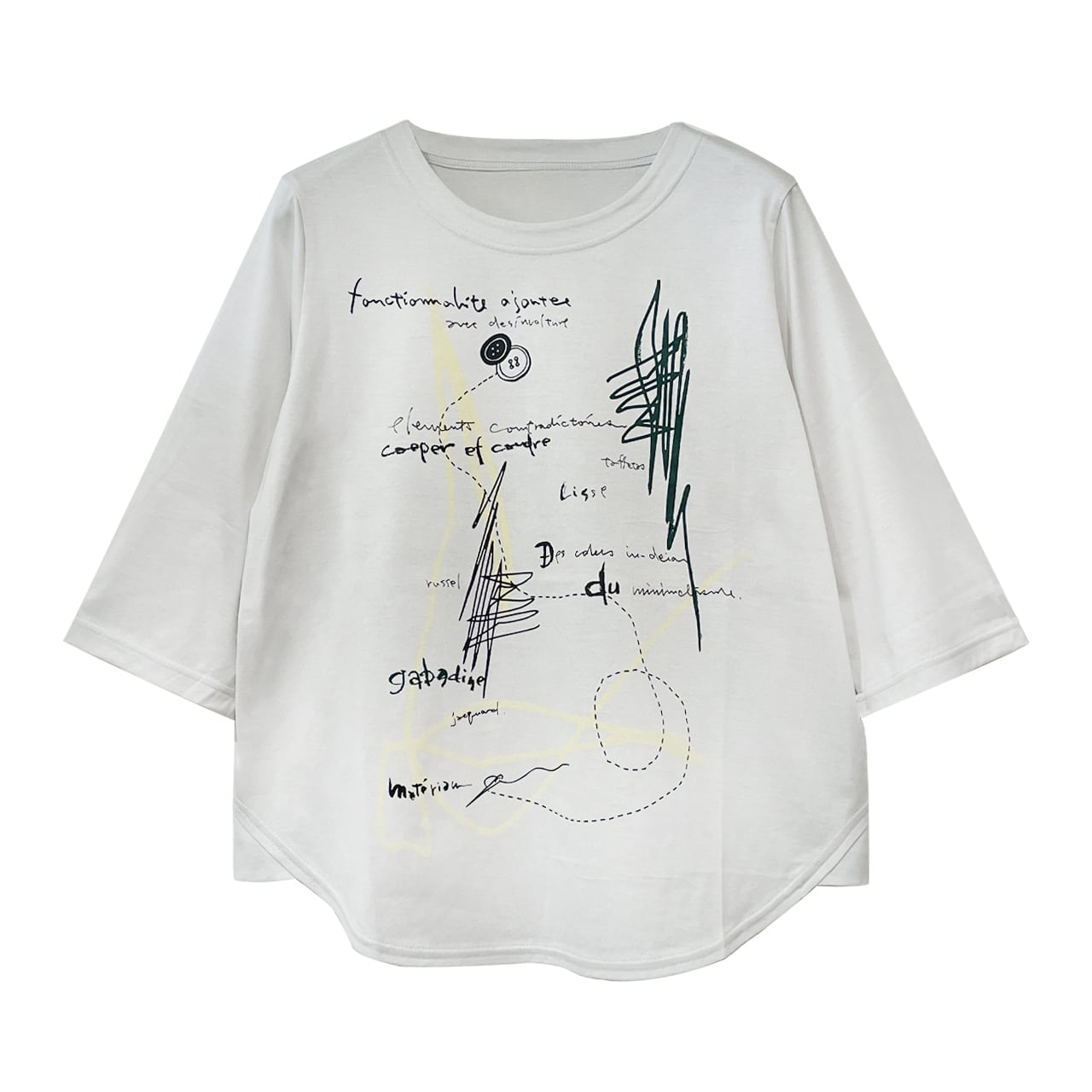 開きすぎないクルーネック、サイド裾に待ちの入ったラウンドヘム、肘が隠れる6分丈のデザインTシャツです。