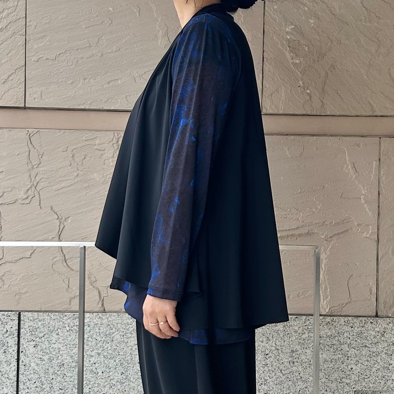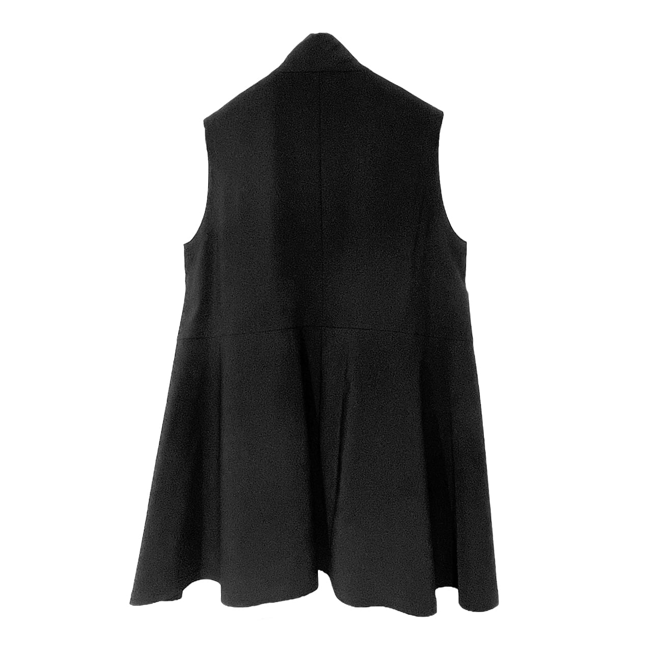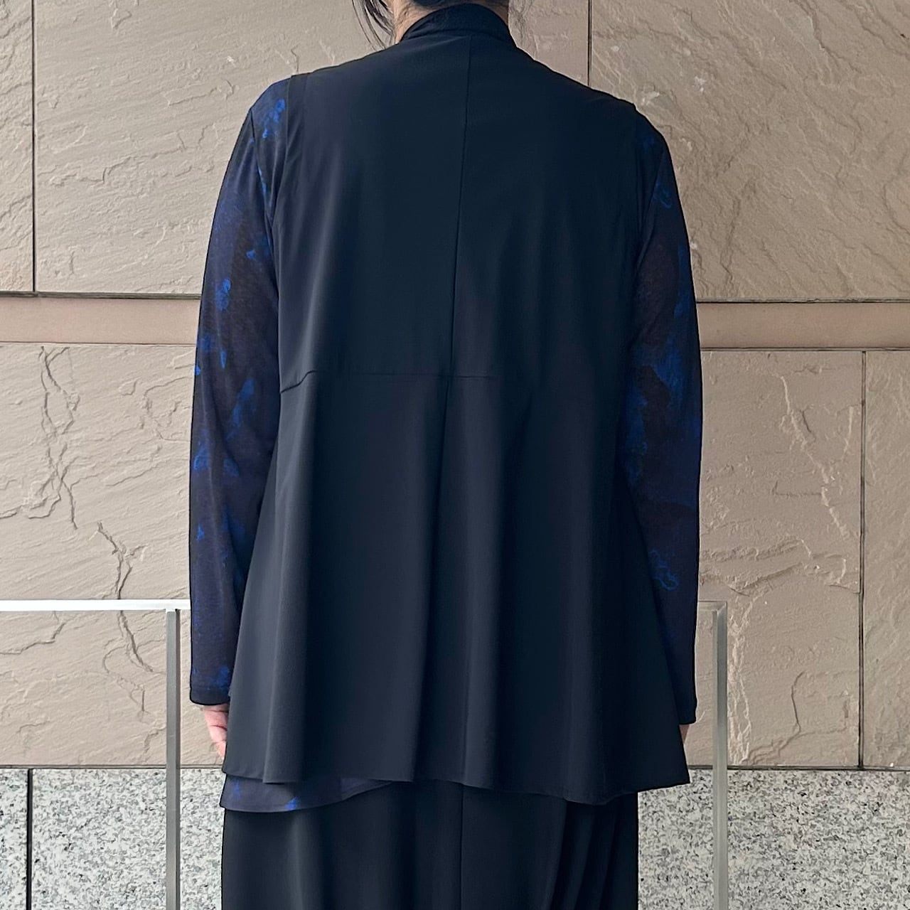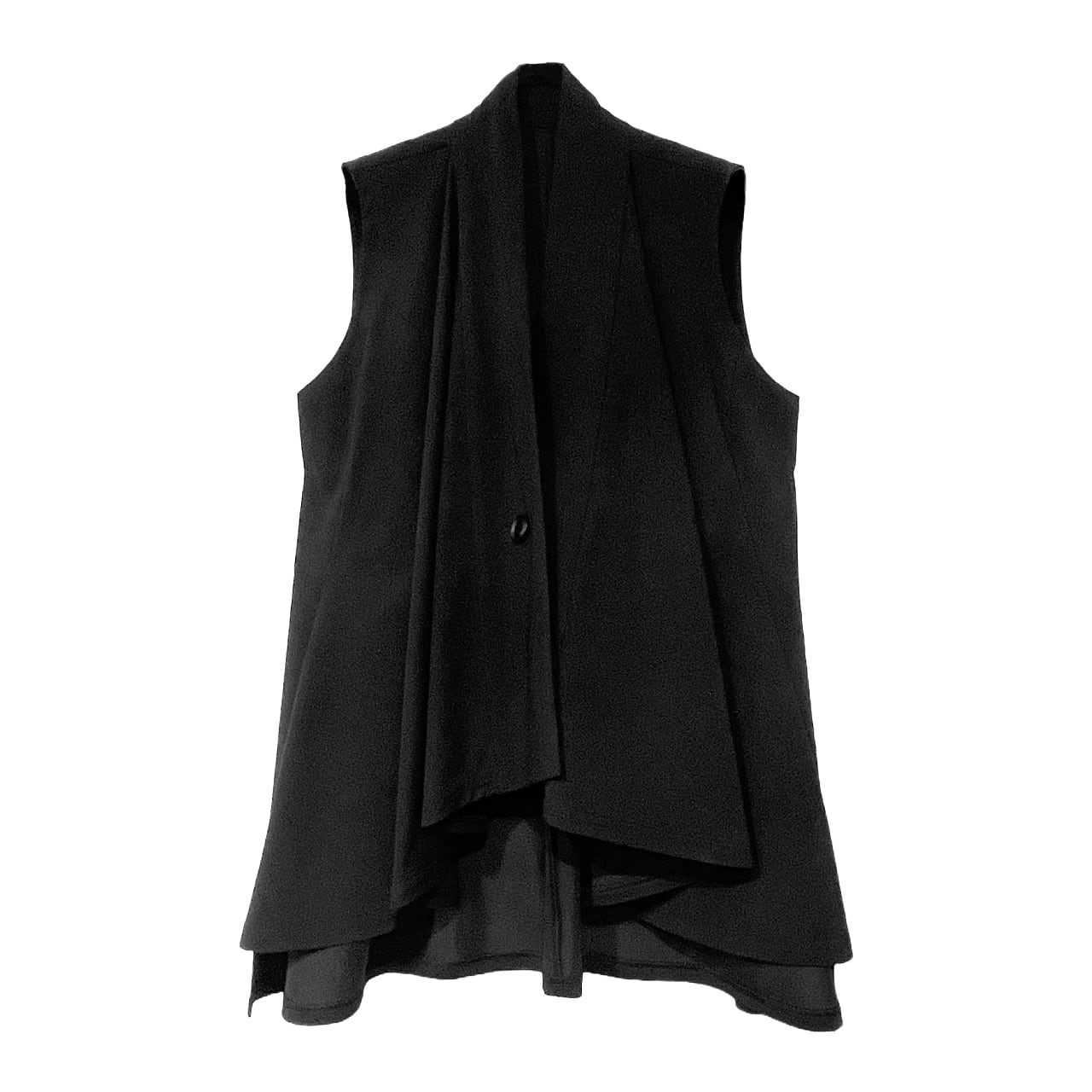フロントは着物合わせ、量感がポイントの着流し風ベストです。