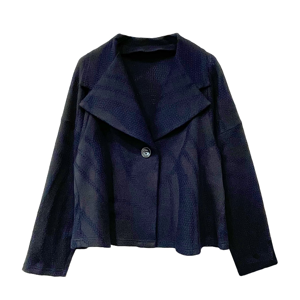 ドレープ性のある大き目のラペル、裾がコンパクトにまとまったジャケットタイプのカーディガンはスタイリッシュなコーディネイトにおすすめの商品です。