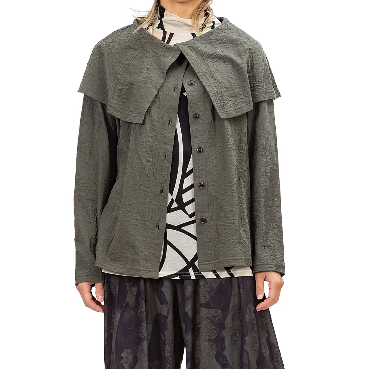 釦の開閉によっても表情が変化し、着こなしのバリエーションを楽しめます。