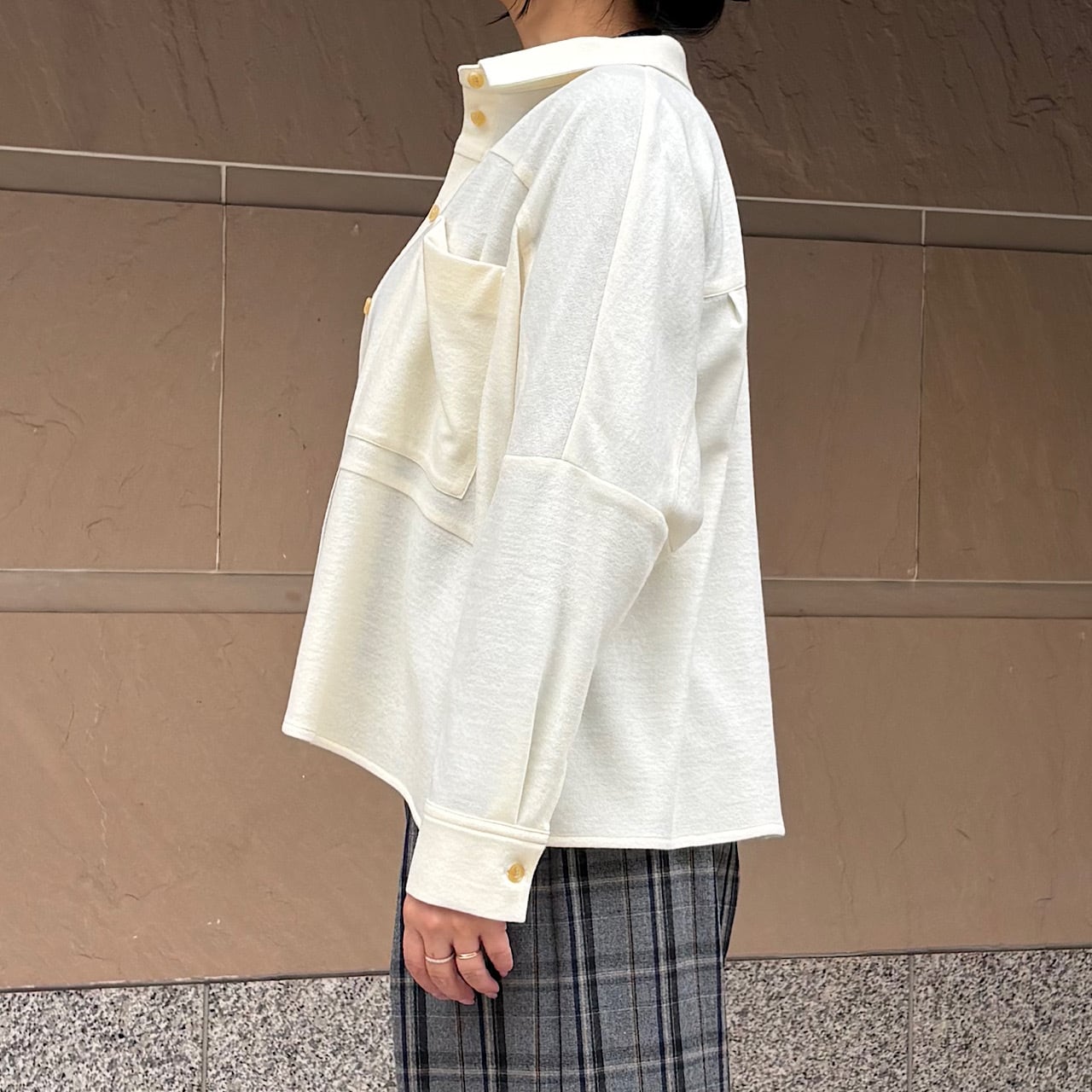 イレギュラーなパッチワーク切り替えが特徴のオーバーシャツデザイン。