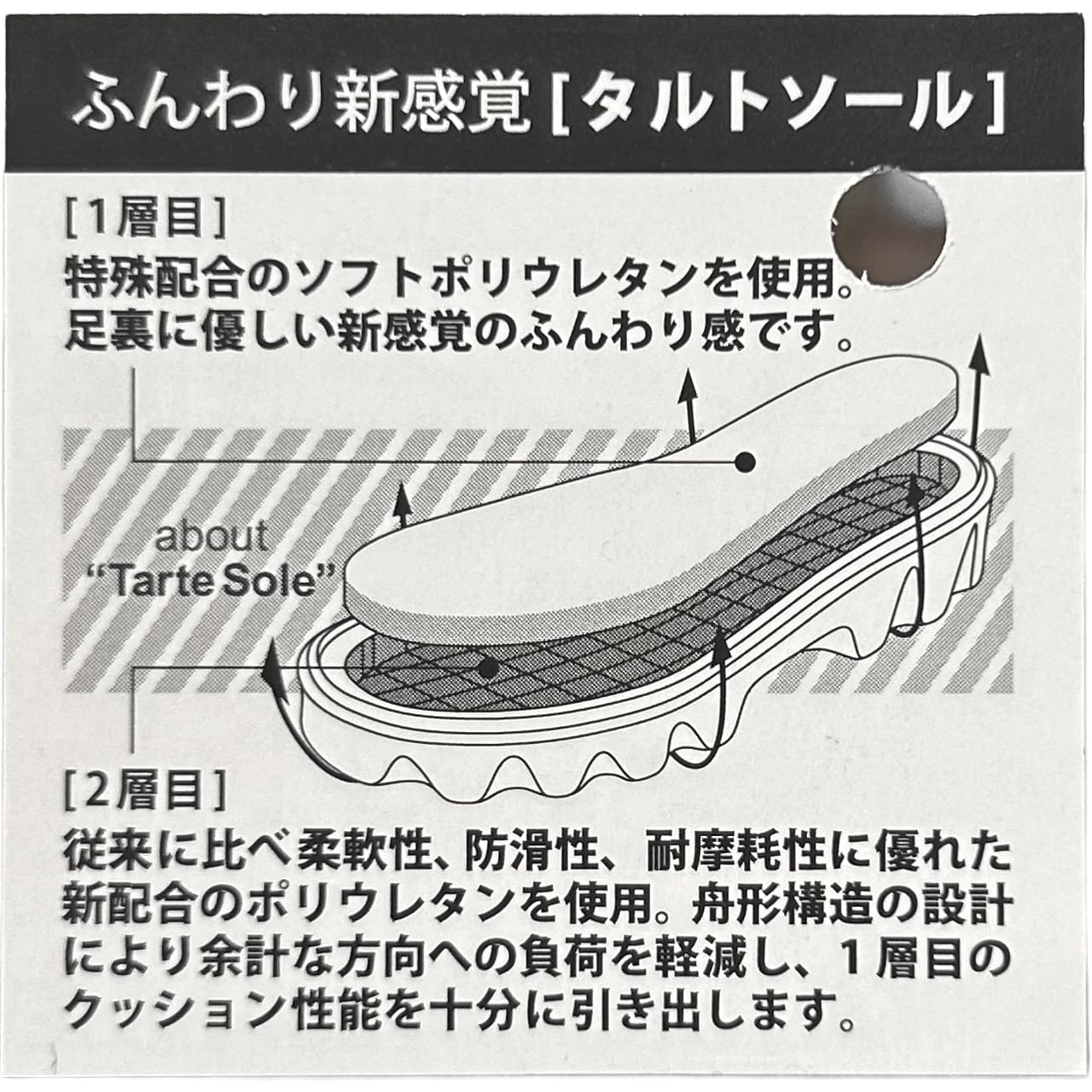 また、ふんわり新感覚の『タルトソール』を採用。柔らかいソフトポリウレタンの1層目で足裏がふんわり、防滑性・耐摩耗性に優れた2層目で歩行の負担を軽減されるブーツです。