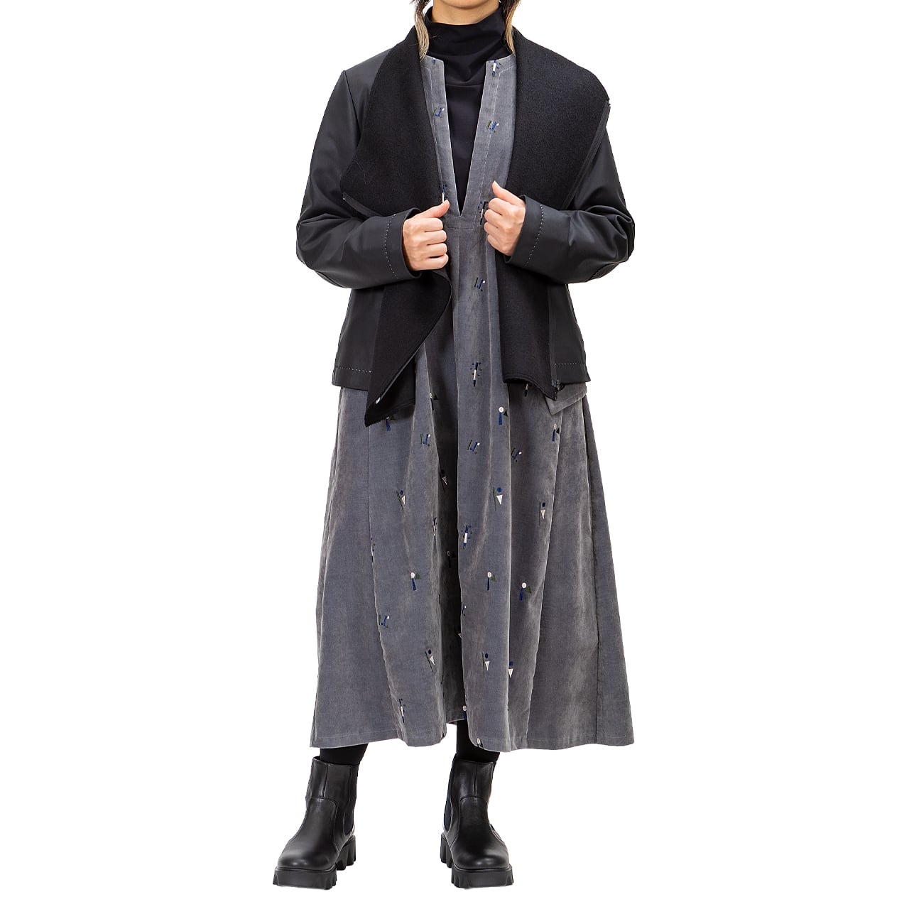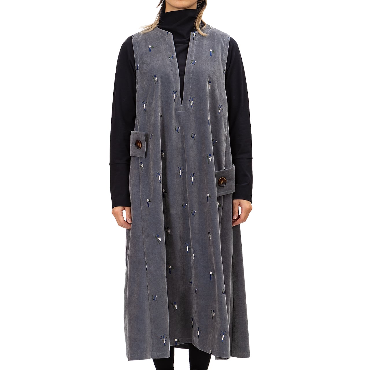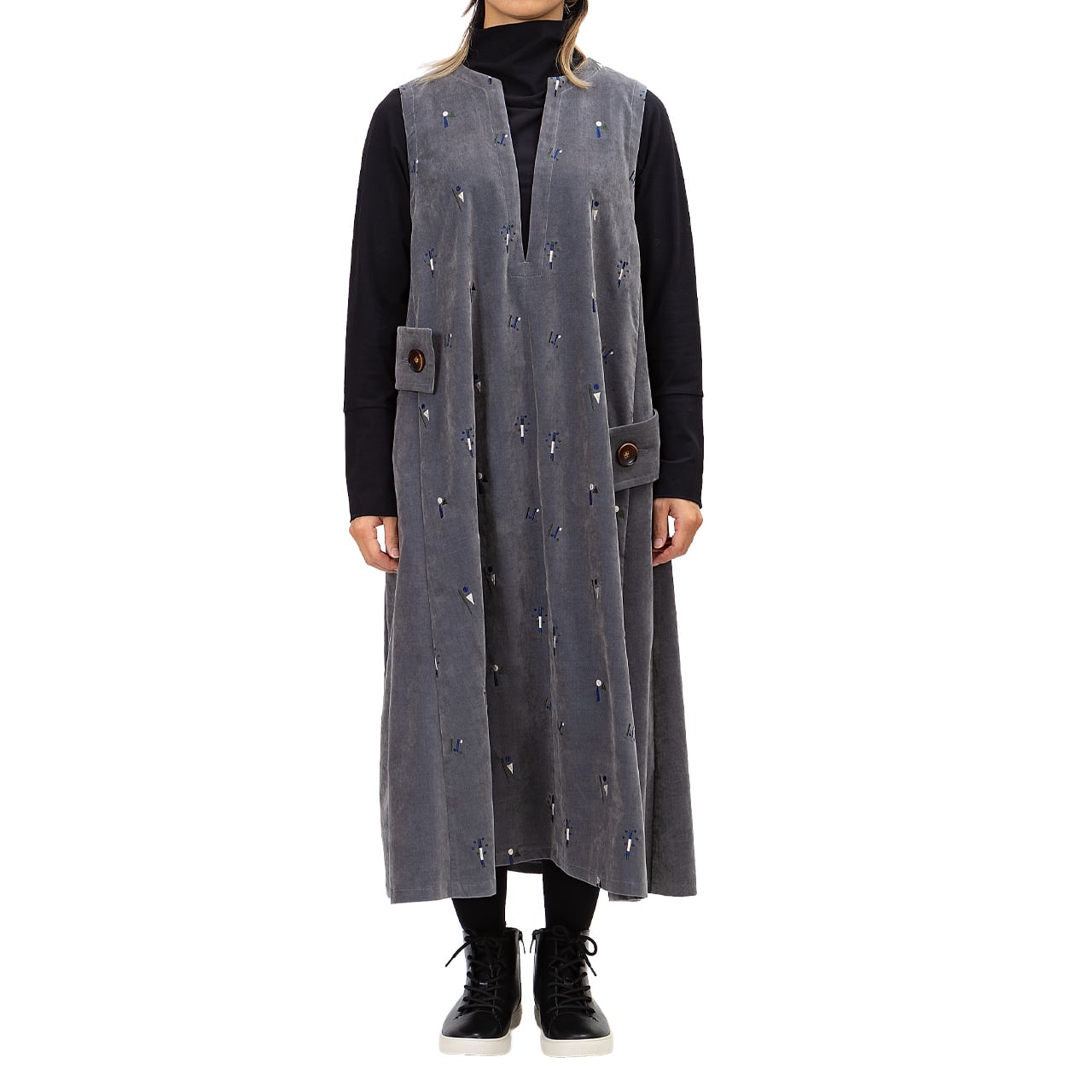 太めのタブがアクセントになったジャンパードレスは、すっきりとしたAラインシルエットでキーネックカラーがシャープな印象です。