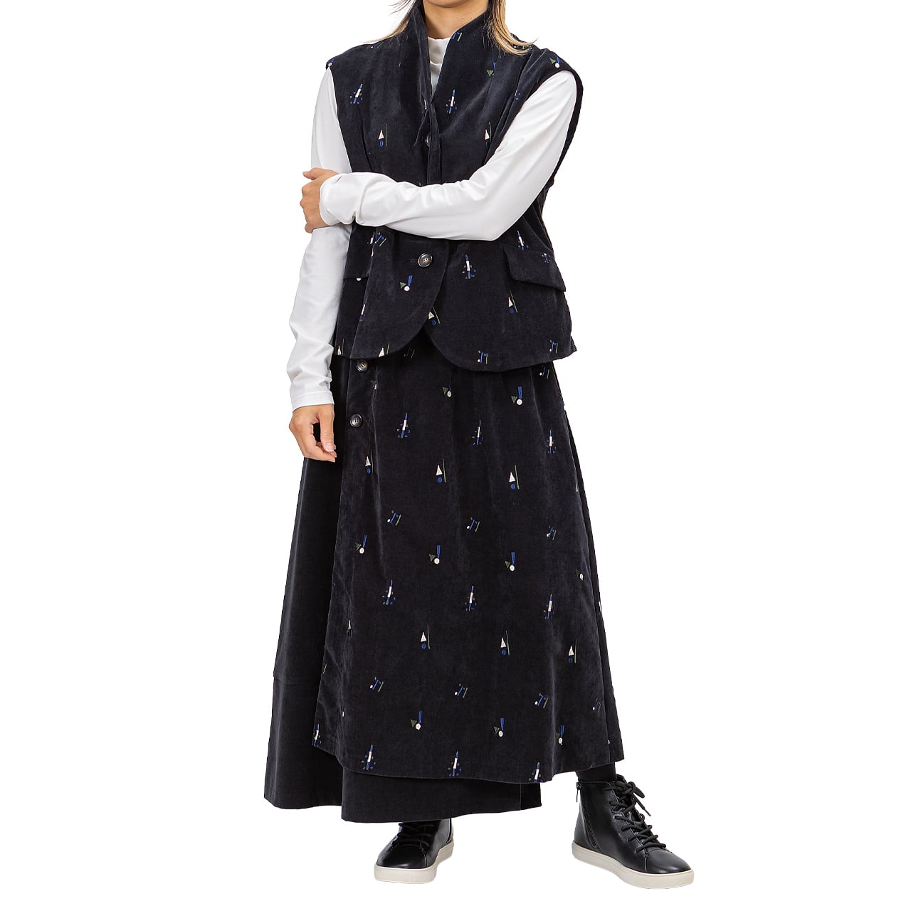 ソフトスタンドタイプのコンパクトベストは、首周りを包み込むような優しい印象がポイント。単品使いからセットアップまで幅広くお使いいただけます。