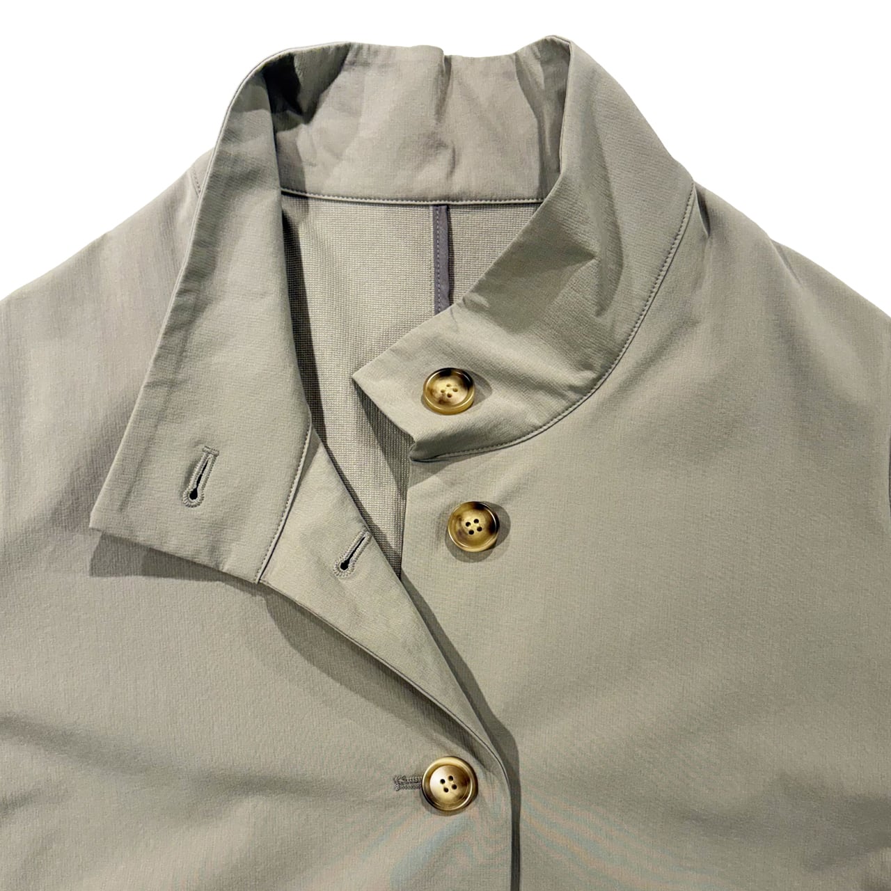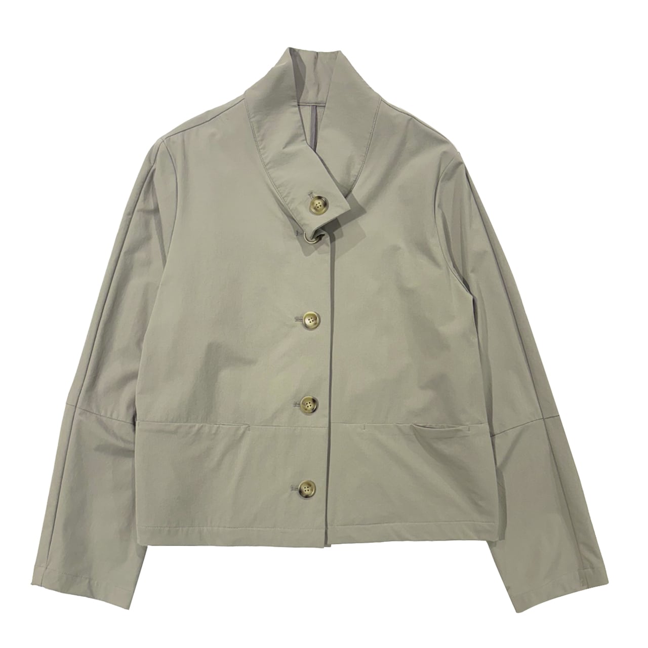 デザインはシンプルなボックスライン、シームポケットがアクセントのスタンドカラータイプ。