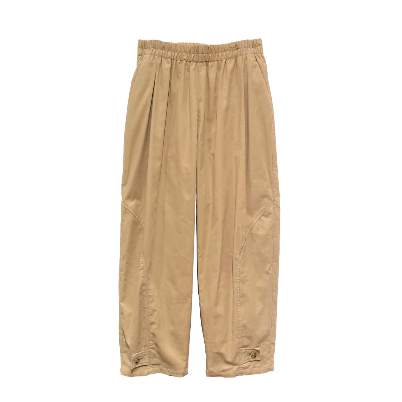 程良いゆとりのあるルーミーパンツは裾のタブでフライトパンツ風に変化させるのもおすすめ。