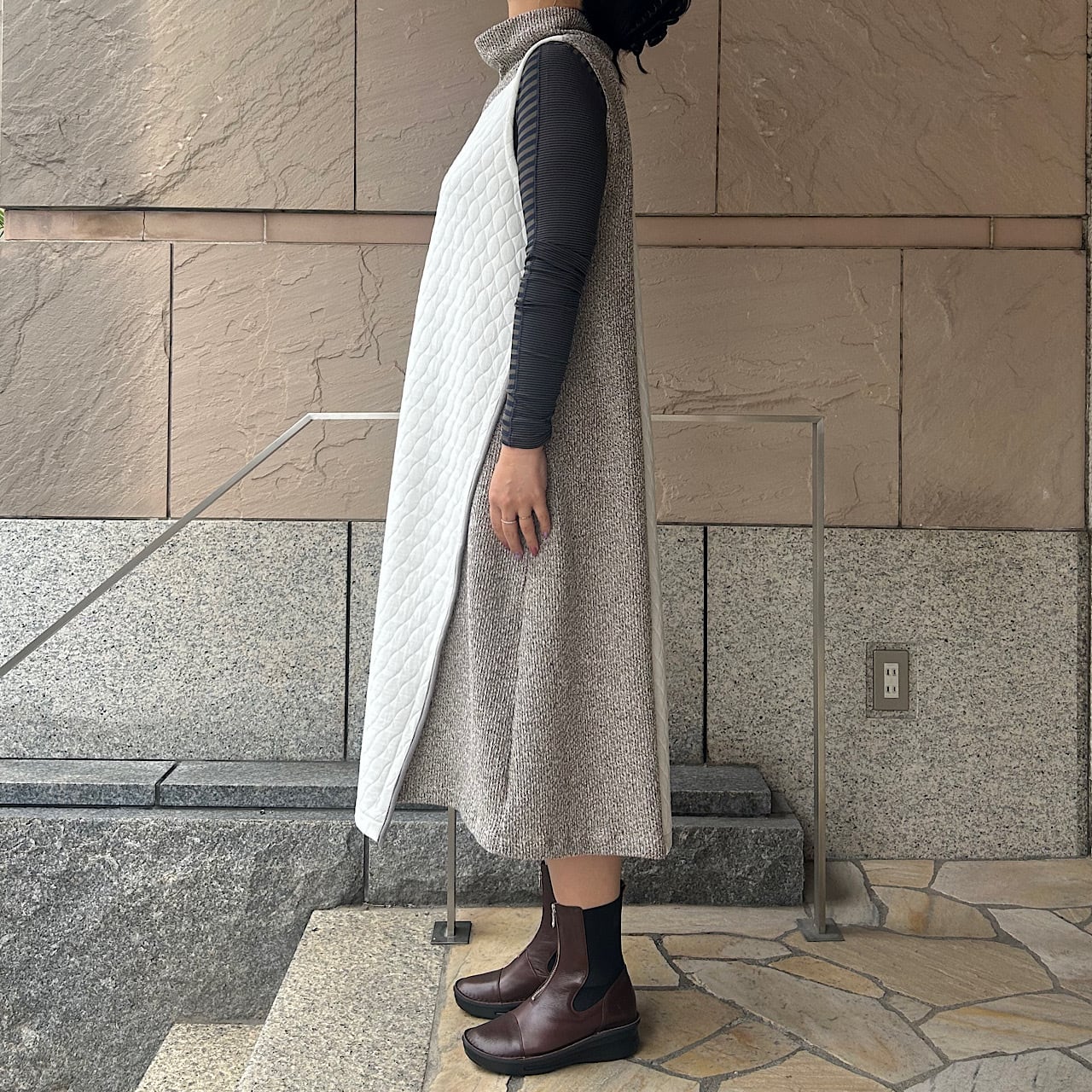 コンパクトなインナーを組み合わせ、タテを強調したスタイリングで着こなすワンピースです。